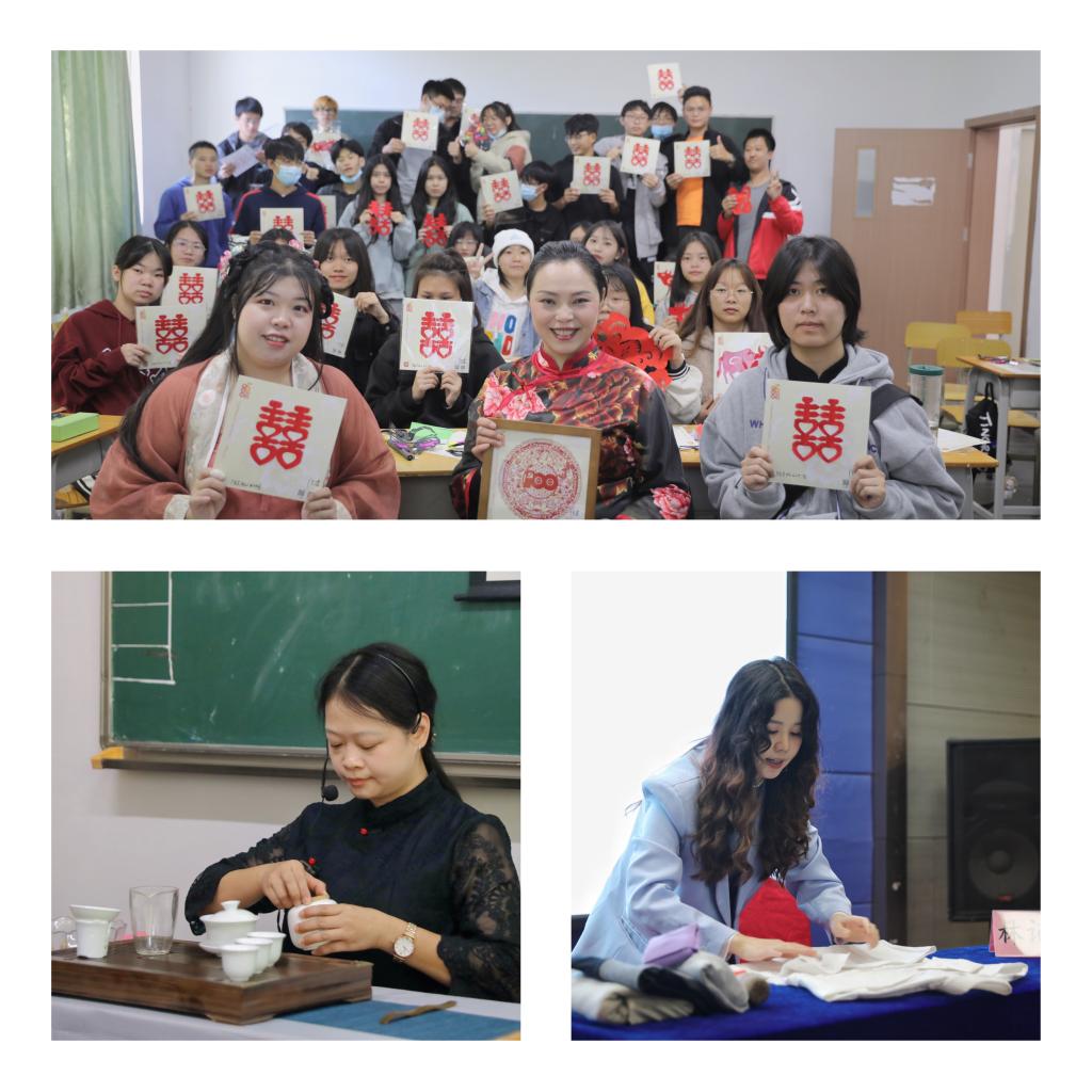 剪纸课上,广东省级非物质文化遗产项目(广东剪纸)代表传承人、首届“佛山·大城工匠”饶宝莲老师率其弟子市级传承人陈小杰等十余名徒弟为同学们献上了一场剪纸的视觉盛宴。同学们通过实操“醒狮”剪纸作品,感受伟大的工匠精神和中华传统文化的博大精深。茶艺课上,同学们从“茶的礼仪、茶起源”“茶类的形成与分类”“茶器的认识”“基本的冲泡法”四个方面了解了茶文化和茶艺知识。收纳课上,收纳师们讲述了收纳对人生的意义、收纳核心原则、收纳工具的介绍与制作,并且走进学生宿舍,就常用的衣物收纳方法挂、叠、卷、摆进行了现场教学和示范指导。