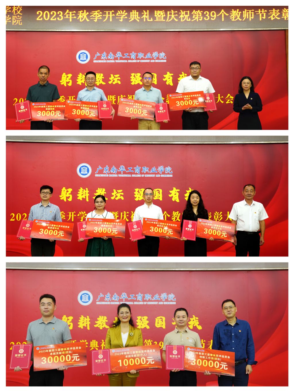 大会对获奖的个人和团队给予表彰奖励,表彰获得“师德楷模”“教学名师”“最美辅导员”“最美班主任”称号教师和“青蓝奖”“卓越贡献个人奖”获得者,为高质量发展综合改革项目颁发“创新工作奖(团队)”,为清远校区二期工程建设项目颁发“卓越贡献奖(团队)”,并为“银龄奖”获得者颁发纪念章,希望受表彰的同志珍惜荣誉、坚守初心、再接再厉,不断提高自身的工作水平,引领集体共同进步,继续为学校的高质量发展全力以赴。