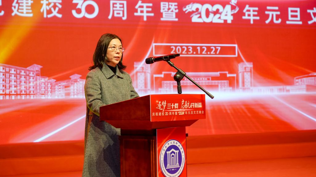 唐晓林代表学校发表了热情洋溢的致辞。她首先向一年来辛勤耕耘在教学、管理等各条战线的全体教职员工,向刻苦学习蓬勃向上的各位同学,向此时此刻正在观看直播的校友,致以新年最美好的祝愿;其次,她指出,2023年是学校建校30周年。南华与时代同行,学校党建持续加强,教育教学成效显著,校企合作再创佳绩,办学条件明显改善,是高质量发展的关键一年。南华全体师生不忘初心、齐心协力,在践行“明德、敬业、求精、惟新”的校训之路上,踏出了更加坚实的一步。习近平总书记告诉我们“奋斗的人生是最幸福的”;最后,她希望全体师生继续坚持以习近平新时代中国特色社会主义思想为指导,踔厉奋发、勇毅前行,坚持用“用劳模精神感召人,用劳动精神培养人,用工匠精神铸造人”的特色育人理念,以高质量发展为主线,以建设教育强国推进中国式现代化为使命,理清思路再出发,昂首迈上新征程。