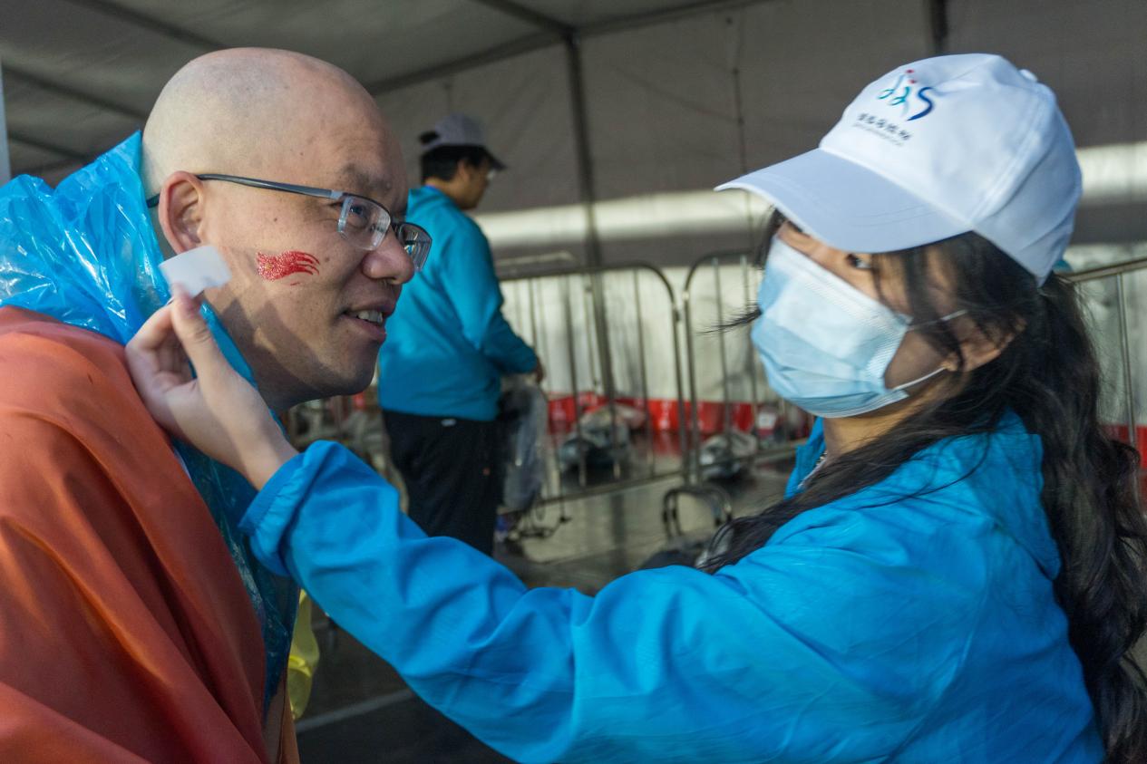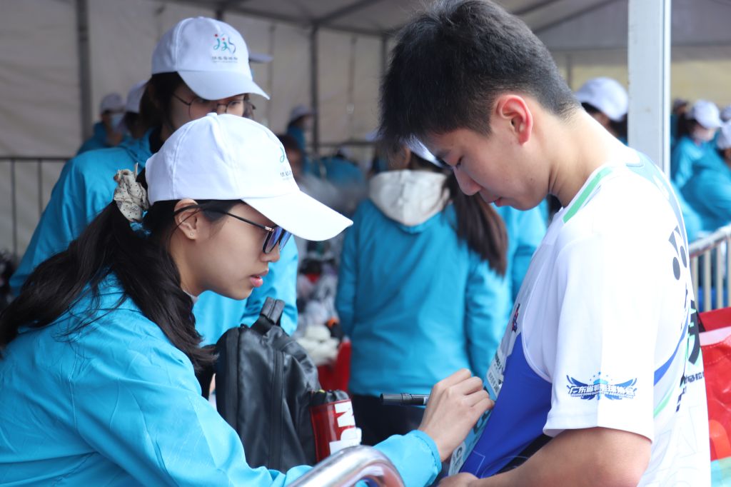 马拉松赛当日凌晨5点,志愿者们迎着晨曦奔赴各自岗位。存包区志愿者负责核对选手信息,检录区志愿者协助裁判,赛前饮水区志愿者提供饮水,奖牌发放区志愿者负责发放奖牌,完赛包发放区域志愿者则发放完赛包,冰敷区志愿者引导运动员到泳池区冰敷。在原定100名氛围组志愿者的基础上,我校临时受命,广泛动员了820名志愿者组成“南华赛道助威团”,在马拉松南华段赛道上,以10个助威点位为依托,通过高喊加油口号、击掌互动、表演歌舞等形式,打造了一条“声浪与热情交织”的助威长廊。