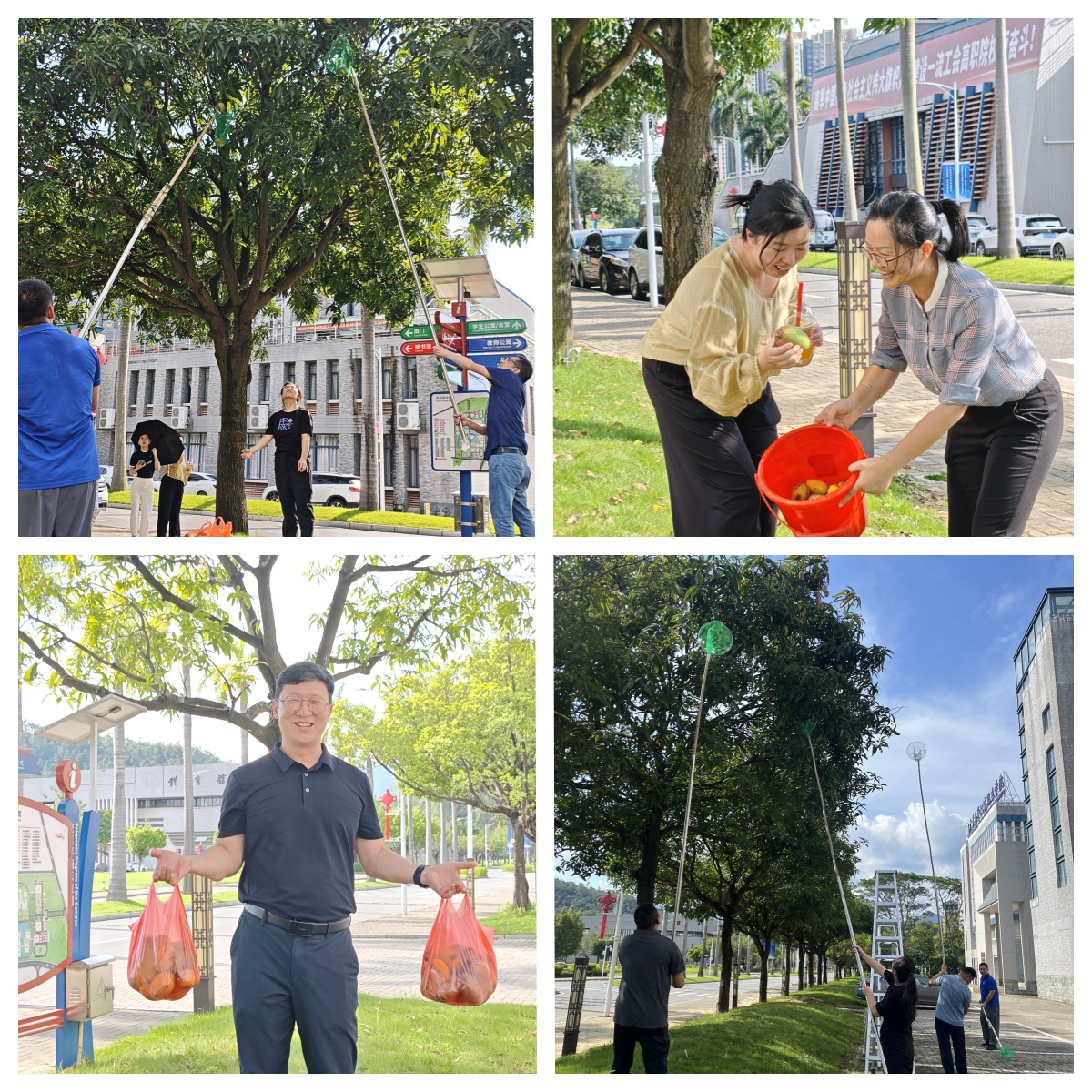 活动现场,校园芒果树硕果累累。教职工以工会小组为单位组成采摘小队,在第一教学楼周边的芒果种植区拉开“丰收之战”的序幕。大家分工协作:有人手持自制工具精准摘果,有人负责传递收纳,有人细心筛选品相,现场充满欢声笑语。