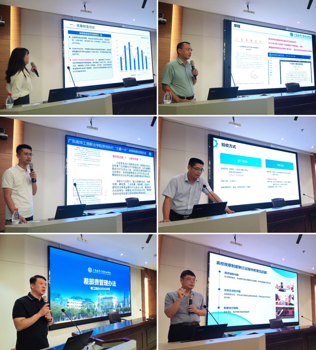 会上,党政办公室(法务室)邓梦莹老师作学校规章制度现状分析报告;科研与发展规划处廖大强教授、党政办公室副主任方永航、资产管理与采购中心副主任廖陈兴、计划财务处副处长王年捷先后对学校《章程》《贯彻执行“三重一大”决策制度实施办法》《采购项目验收管理办法(试行)》《差旅费管理办法(修订版)》等6项规章制度进行宣讲;学校法律顾问朱青山律师作了题为“高校规章制度法律风险防控”专题培训,以案例的形式分析了规章制度制定及实施中的常见问题,并就构建合法性与正当性相统一的制度体系建言献策,为学校规章制度建设提供了专业支持。