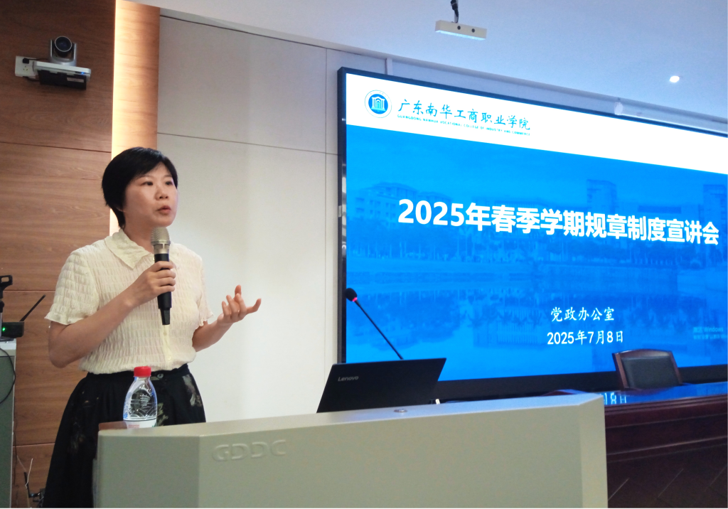 为进一步健全学校规章制度体系,推进各项制度有效实施,根据《广东南华工商职业学院2025年依法治校工作任务清单》部署,7月8日,学校党政办公室牵头科研与发展规划处、资产管理与采购中心、计划财务处在天河校区培训楼101阶梯教室举行2025年春季学期规章制度宣讲会。学校党委委员、纪委书记黄一梅出席会议。