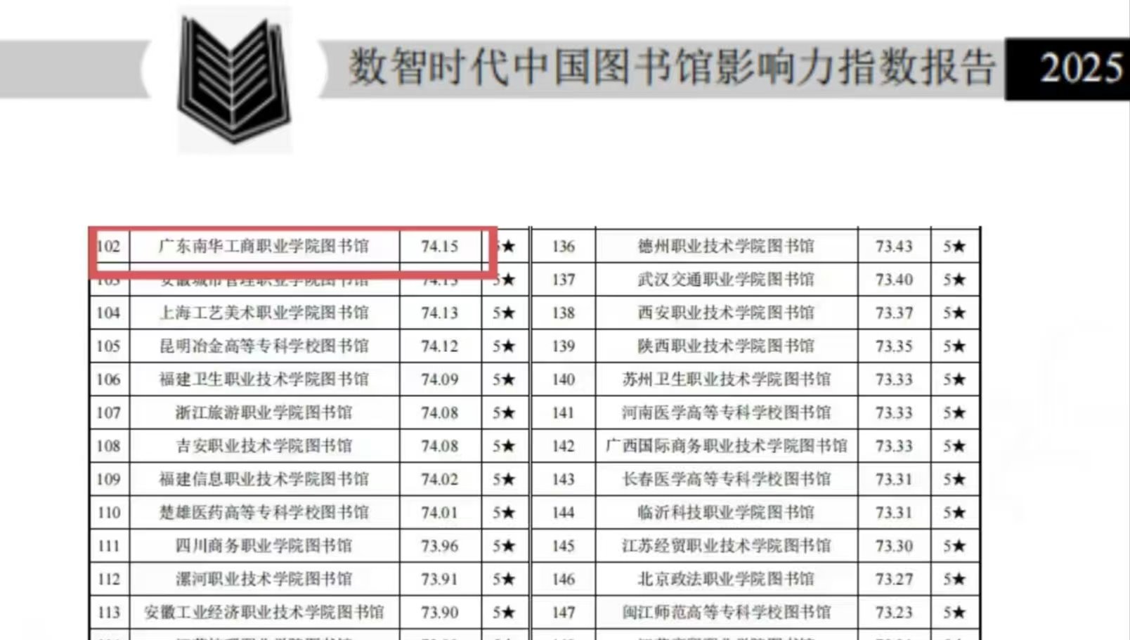 2025年12月29日,《数智时代中国图书馆影响力指数报告(2025版)》正式发布,我校图书馆从全国1554所高职院校中脱颖而出,首次上榜“5星图书馆”,标志着我校图书馆建设迈上新的台阶。