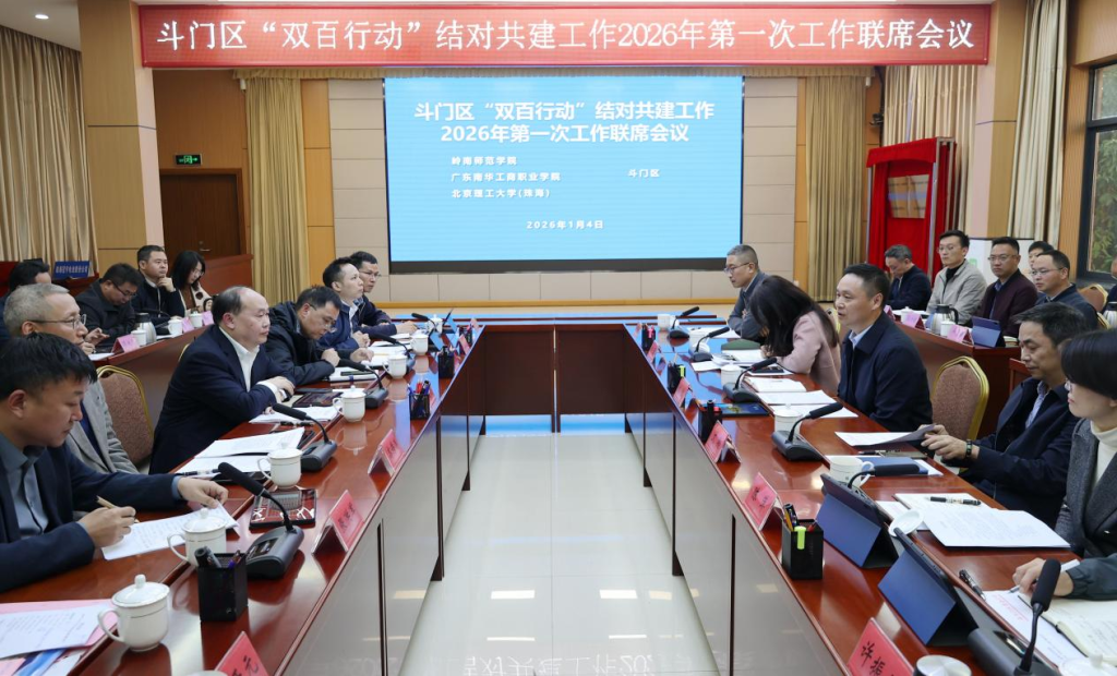 1月4日,斗门区委、区政府召开“双百行动”结对共建工作2026年第一次联席会议。斗门区委书记刘宏,珠海市“百千万工程”指挥办四级调研员文翔,珠海市委教育工作委员会、市教育局副局长方蕾出席会议。我校党委副书记、副校长严新及两所结对学校的领导受邀参会。