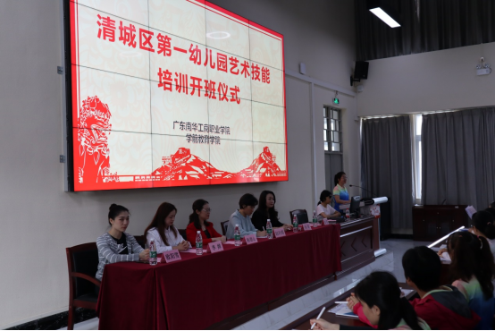 为进一步提高清远幼儿园教师专业素质,推动清远幼儿园高质量发展。清远市清城区第一幼儿园委托我校学前教育学院开展为期6天的教师艺术技能培训。2021年4月17日上午9:00,培训开班仪式在清远校区教学楼101举行。清城区第一幼儿园杨碧山园长、李琴副园长,以及学前教育学院党支部书记、副院长赵玲霞、支部副书记李婵、专业教师欧阳雪、辅导员刘景辉出席本次开班仪式。