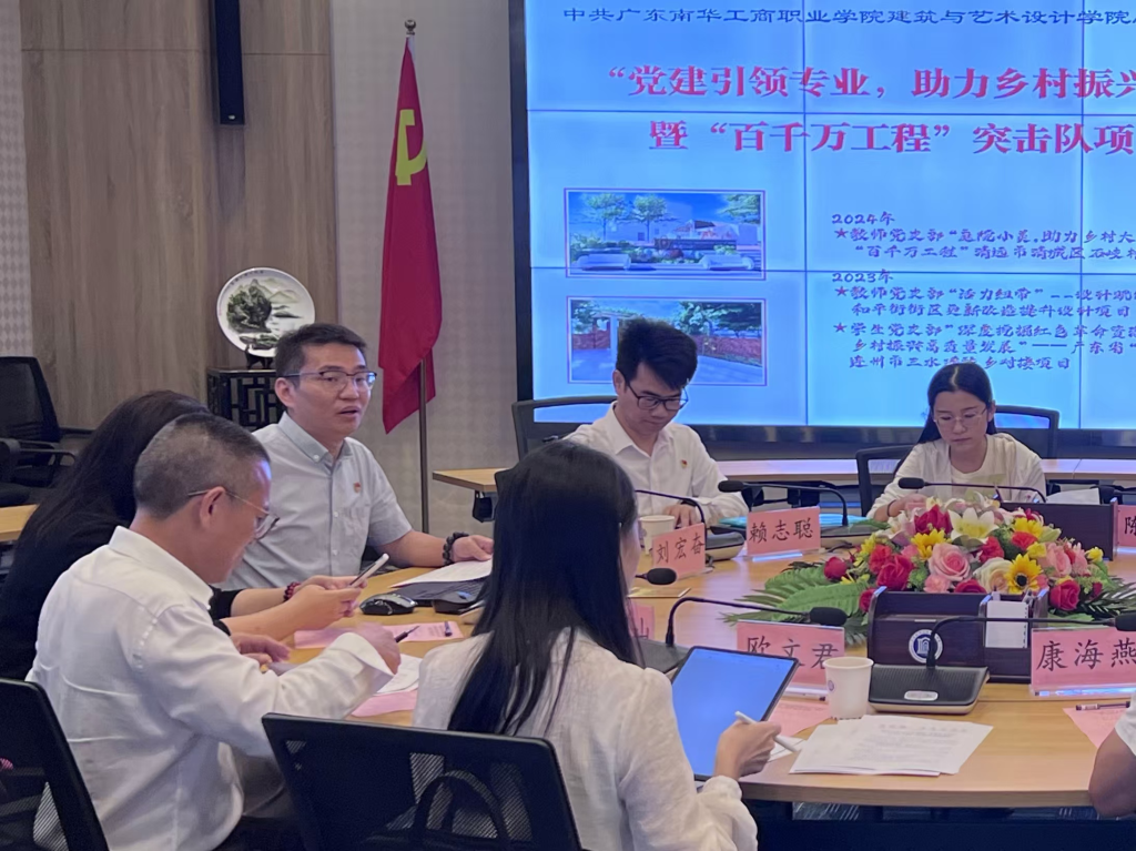 学院党总支书记助理刘宏奋详细汇报了两年来“党建引领专业,助力乡村振兴”书记项目和“百千万工程”突击队项目的实践情况,并展示了相关设计作品,同时反思了活动经验,展望了未来发展趋势。建筑与艺术设计学院“党建引领专业,助力乡村振兴”书记项目自2023年启动以来,在各方鼎力支持下在助力乡村振兴方面初显成果,教师发表乡村振兴学术论文4篇,师、生党支部组建“百千万工程”突击队赴清城区石角镇、英德市浛洸镇、连州市三水瑶族乡开展社会服务实践活动,充分发挥专业特长为美丽乡村建设注入青春力量。项目成果获得第三届印迹乡村创意设计大赛省级赛暨第二届粤乡印迹创意设计大赛优秀奖,清远市“百千万工程”成果展示大赛中荣获省职教城赛道决赛三等奖,获得南方Plus、清远Plus、清远日报视频号等主流媒体关注与报道。