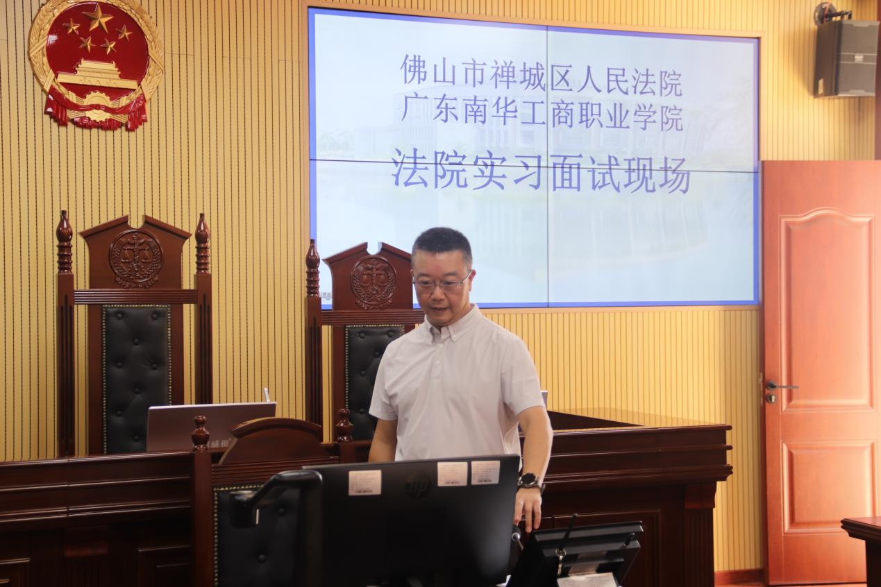 佛山市禅城区人民法院政治部副主任肖华、丁泽元、司法行政人员何世界、潘焰英,应用法学与公共事业学院法律事务专业负责人罗丽珍、辅导员袁金苑参加交流活动。