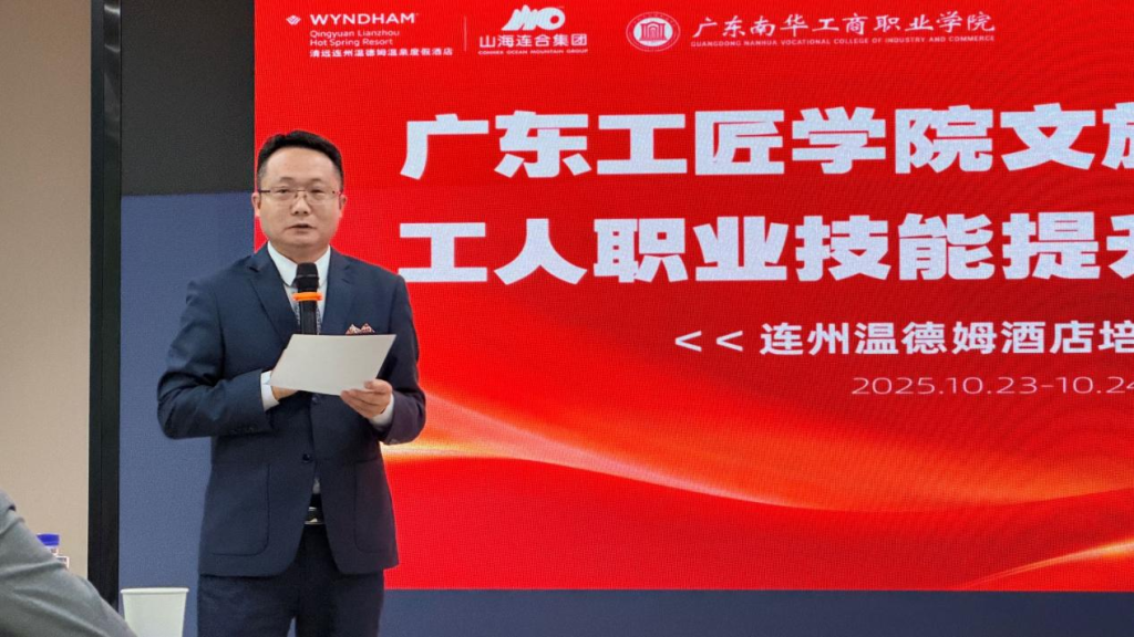 为深入贯彻落实广东省总工会关于“产业工人队伍建设改革”和广东省人力资源和社会保障厅关于职业技能提升行动的部署要求,广东工匠学院联合二级学院,面向广东省文旅行业一线在职从业人员开展职业技能培训项目。10月23日至24日,文旅产业工人职业技能提升培训第一站在清远连州温德姆温泉度假酒店顺利开班,来自酒店前厅、客房、餐饮、景区等部门全体员工200余人次参与培训。文化旅游学院副院长谭金凤与教师李林玫、刘又榕、郭伟欣及数字创意学院教师黎文煜担任此次培训讲师,开展培训工作。