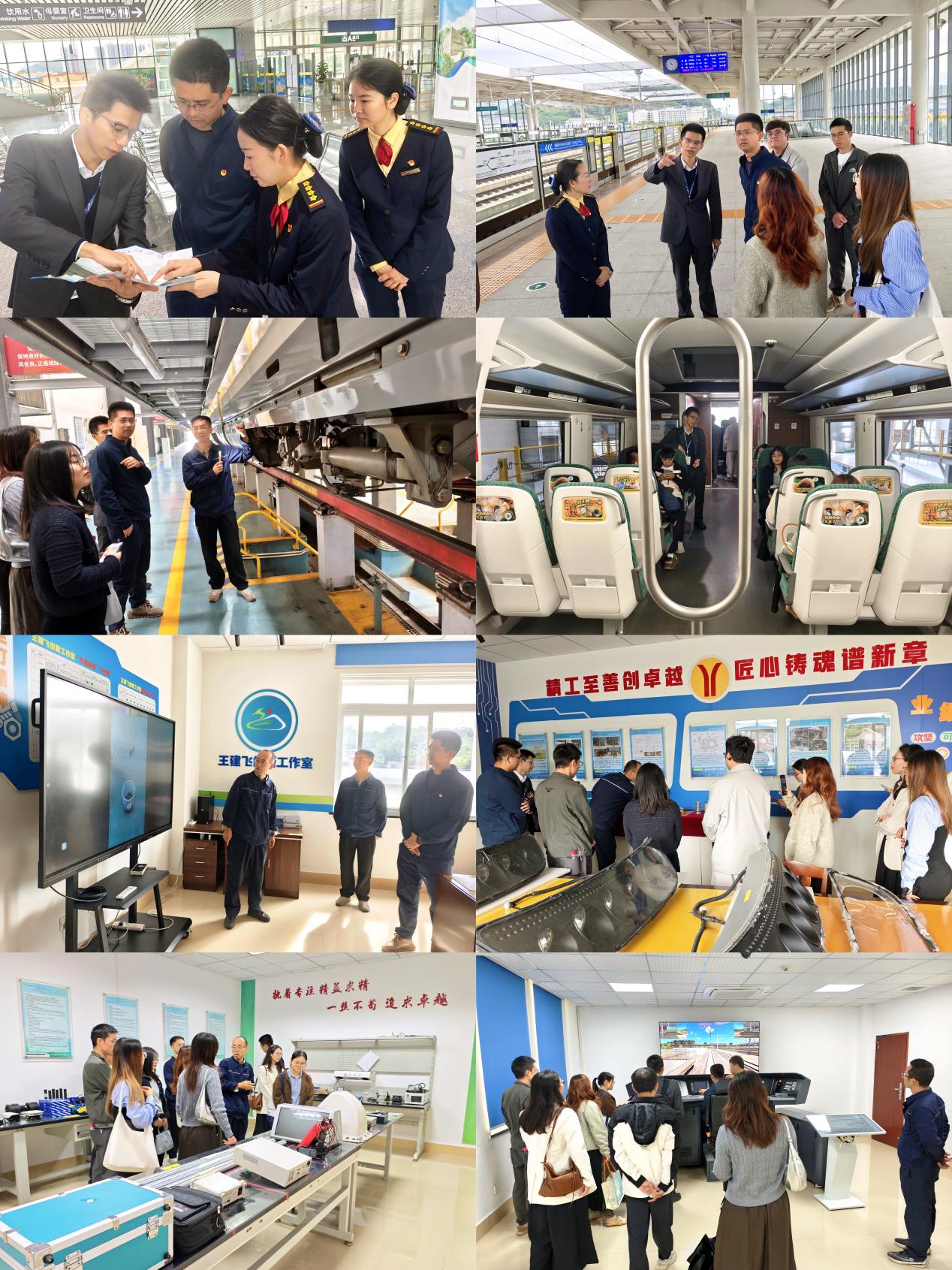 大家首先来到飞霞轻轨站了解车站的日常运营、客运组织流程及智能化客服设施,“零距离”感受了现代化轨道交通的便捷与高效,对一线运营岗位的职责与要求有了直观的认识。随后,大家前往龙塘动车所进行参观。作为动车组的“4S店”和“休整基地”,动车所内先进的检修设备、严谨的作业流程和科学的管理体系给老师们留下了深刻印象。座谈期间,双方就搭建志愿者基地框架具体细节进行深入探讨,为后续共建大学生志愿者基地的实质性推进奠定了基础。