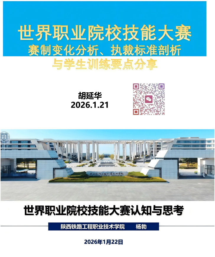 首期培训在1月21日-22日,主题为“世界职业院校技能大赛备赛策略优化与教师指导能力提升”,由深圳职业技术大学胡延华教授、陕西铁路工程职业技术学院杨勃教授授课。胡延华教授立足大赛新形势,系统解读了赛事最新趋势与执裁标准,结合自身丰富的指导经验,分享了从选题构思、方案设计到科学指导、细节打磨的全过程备赛经验;杨勃教授全面梳理了世界职业院校技能大赛体系,构建了从团队组建、系统化训练到赛时应急应对的完整实战框架。两位专家的分享各有侧重、互为补充,为我校教师提升赛事指导能力、精准备战各类技能大赛提供了清晰思路。