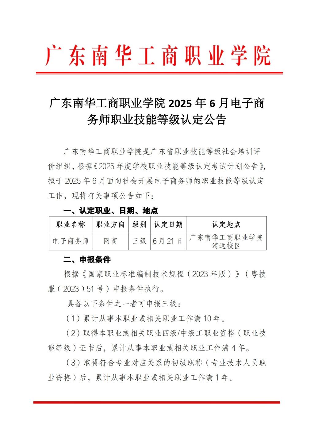广东南华工商职业学院2025年6月电子商务师职业技能等级认定公告