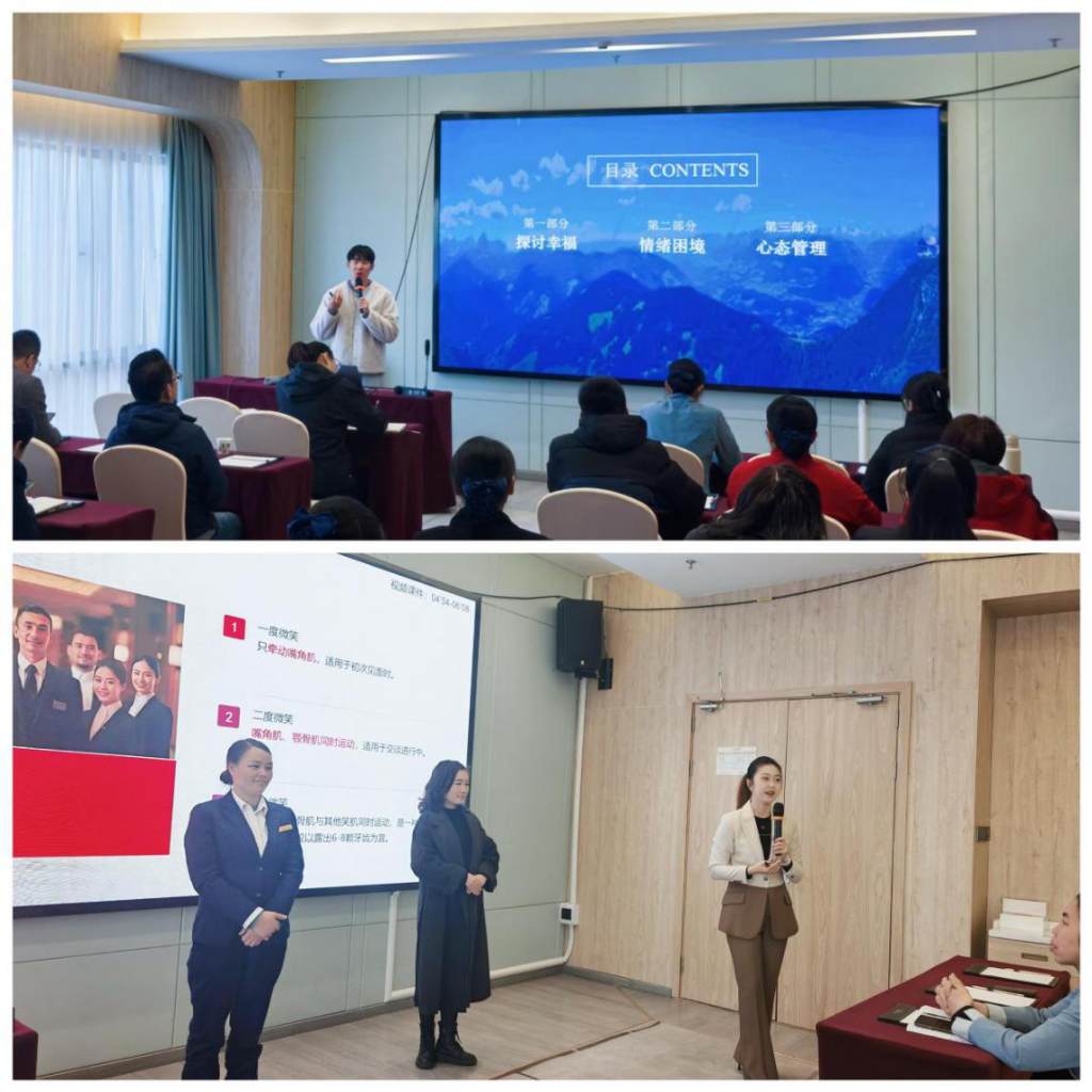 郭伟欣主讲《做个幸福职场人——积极心理学视角下的情绪压力管理》课程,通过互动游戏与心理疏导技巧传授,帮助员工调整工作心态,提升职业幸福感;李林玫主讲《企业形象的“金钥匙”—服务接待礼仪标准》课程,从迎客礼仪、递接礼仪、仪容仪表、仪态礼仪等细节入手,规范服务流程标准化,运用专业肢体语言,塑造酒店职业礼仪形象。