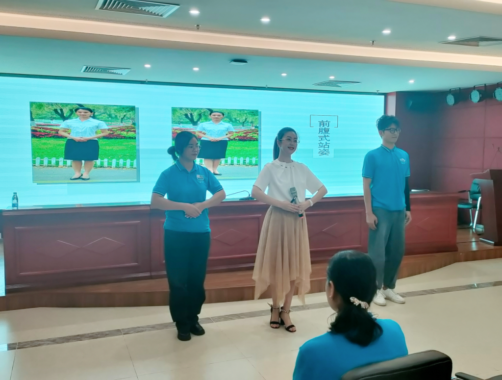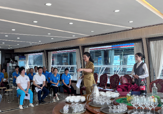 谭院长围绕服务礼仪、就餐服务的基本程序和标准、餐饮服务基本技能三方面开展培训,重点对餐饮流程、技巧、语言、餐饮商务接待标准、上菜技巧、菜品文化介绍、餐台摆设、商务接待注意事项进行了讲解及现场实景演示。李林玫围绕游轮礼仪服务标准化管理为主题,通过理论讲解、现场示范和学员实操演练相结合开展培训,包括仪容仪表、仪态、言语表达、接待礼仪等四个方面,教授实用性强、满足日常工作所需的礼仪培训课程。刘又榕围绕北江游船路线,不仅从理论方面讲解服务语言、服务技巧两方面内容,同时根据公司实际业务,给学员讲述清远简要历史背景、北江游船沿线的景区景点、北江河鲜美食及横跨北江各大桥等游览景点介绍,并鼓励学员即学即用进行演示。水面公司领导和学员们对培训内容给予高度评价,表示能够学以致用,在实践中不断提升专业素养与客户满意度,营造优质服务环境,强化服务理念,高标准做好接待工作,做优做强北江游品牌。