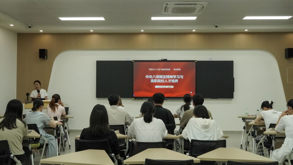 党支部书记潘新洁以《中央八项规定精神学习与高职院校人才培养》为题讲授专题党课,从三个维度系统阐释作风建设与育人工作的结合点:一是提高政治站位,深刻认识中央八项规定作为全面从严治党“第一刀”的时代意义,以“抓铁有痕”的韧劲推进作风建设。二是聚焦育人主责,将廉政教育、职业操守融入课程思政,在创新创业教育中强化法律意识,实现“润物无声”的价值引领。三是坚持问题导向,从教学管理细节入手,推动纪律教育与教书育人同频共振,打造风清气正的育人环境。潘新洁谈到,作风建设没有休止符,只有进行时,要以“抓铁有痕、踏石留印”的劲头,持续深化中央八项规定精神的学习,让清风正气充盈校园每个角落。