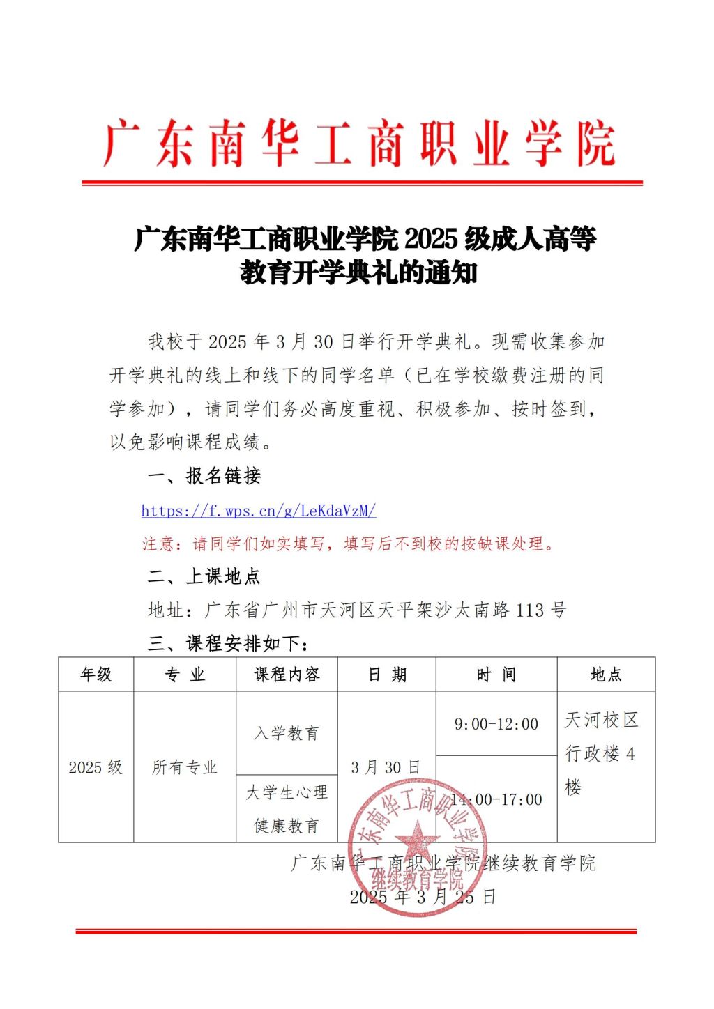 广东南华工商职业学院2025级成人高等教育开学典礼的通知