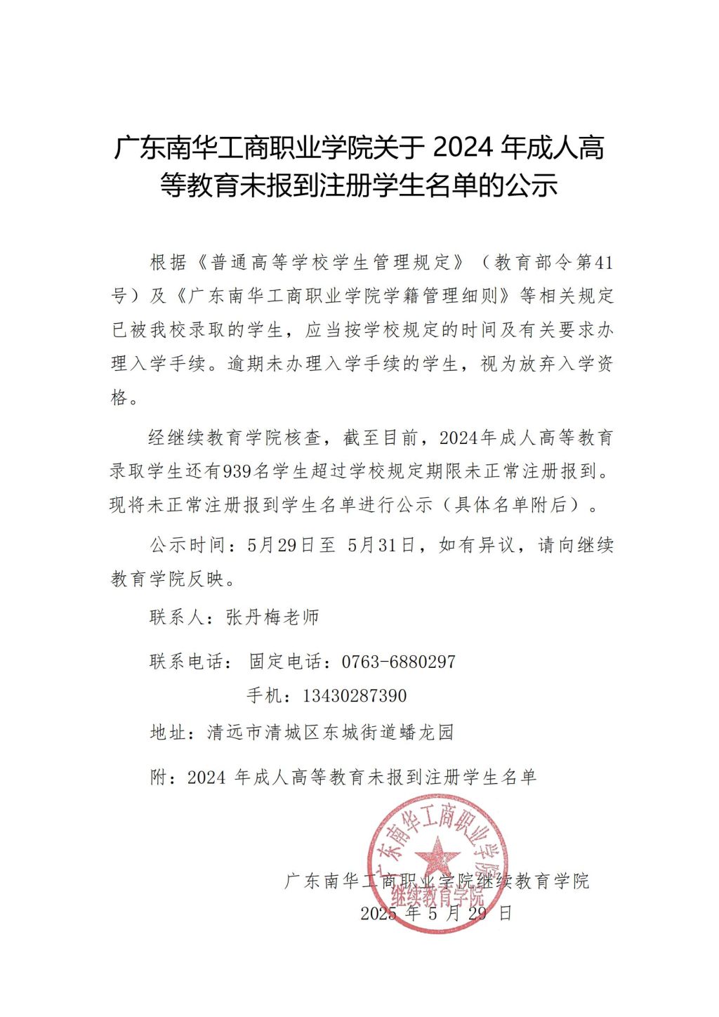 广东南华工商职业学院关于2024年成人高等教育未报到注册学生名单的公示