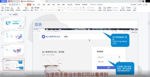 接下来典礼的第三项议程是由成人教育平台技术老师给大家讲解如何使用学习平台。网络科技化越来越得人心,我们的学员现在可以足不出门就能学习到知识。今天,我们即将开启大学的大门。希望你们用自信的豪情化作利剑,扫除求学途中的重重障碍,用坚实的努力去打拼自己的未来,用辛勤的汗水去书写每一份希望的答卷。