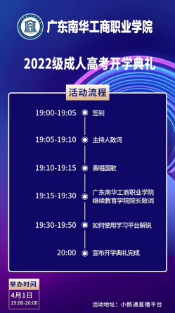 春意盎然,温暖如夏,又是一年开学季。4月1日晚上7点,广东南华工商职业学院继续教育学院2022级新生“云”开学典礼在我院培训楼多功能阶梯会议室隆重举行。我院继续教育学院黄玉良副院长、教师代表李国旭老师,以及来自全省各地1300多名2022级新生参加了本次典礼。