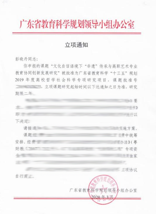 2020年3月,艺术设计系主任、环境艺术设计专业专任教师彭晓丹的科研课题“文化自信语境下“非遗”传承与高职艺术专业教育协同创新发展研究”批准为广东省教育科学“十三五”规划 2019 年度高校哲学社会科学专项研究项目。这是环艺、建装、风景园林专业教师在非遗研究方面取得的另一重大突破。