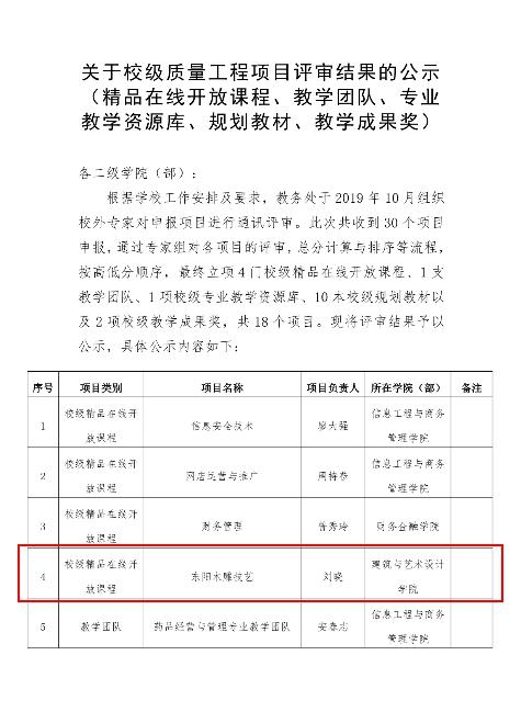 经过校外专家评审,建装、环艺专业教师校级规划教材 4本,精品在线课程 1 门获得立项。其中包含环境艺术设计专业刘晓老师的《东阳木雕技艺》校级精品在线开放课程;建筑装饰工程技术专业杨思维老师的《展示设计》校级规划教材;环境艺术设计专业彭晓丹老师的《软装设计》校级规划教材;建筑装饰工程技术专业陆文娴老师的《室内效果图快速渲染表现》校级规划教材,特此祝贺。