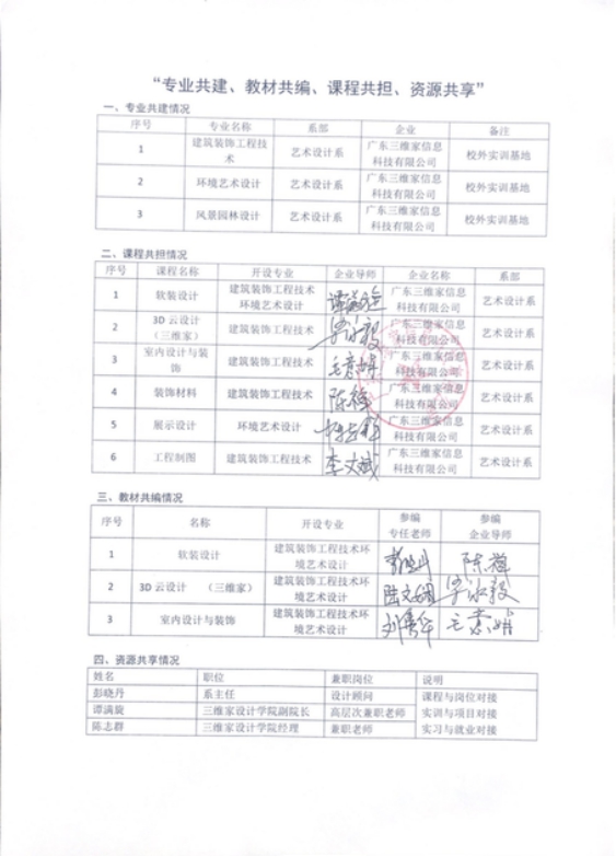 经过多次沟通交流,2019年6月1日,建装装饰工程技术专业、环境艺术设计专业与广东三维家信息科技有限公司达成战略合作,双方达成“专业共建、教材共编、课程共担、资源共享”的合作理念,是建装、环艺专业建设的重要里程碑。通过合作可以促进专业更好的与行业接轨,促进教学资源建设、师资团队建设、实训基地建设与学生就业工作。