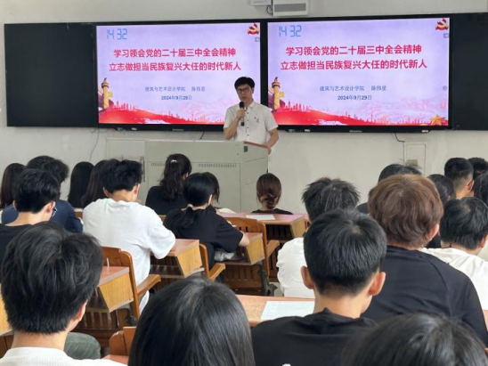 为深入学习宣传、贯彻落实党的二十届三中全会精神,深入贯彻习近平总书记关于思政课建设的重要指示批示精神,根据《广东省教育厅关于做好 2024 年秋季学期大中小学校党组织书记、校长上第一堂思政课工作的通知》和学校《关于成立党的二十届三中全会精神宣讲团并开展宣讲活动的通知》要求,建筑与艺术设计学院院长陈伟星于9月29日下午讲授以“学习领会党的二十届三中全会精神,立志做担当民族复兴大任的时代新人”为主题的2024年秋季学期第一堂思政课。
