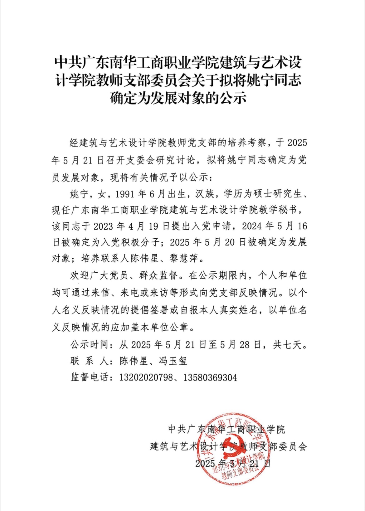 上一条: 中共广东南华工商职业学院建筑与艺术设计学院学生支部委员会关于拟将陈文盈等十名同志确定为发展对象的公示