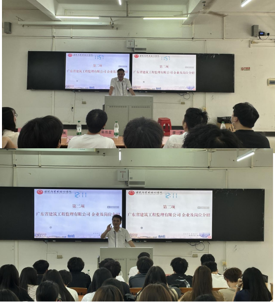4月29日,广东省建筑工程监理有限公司与建筑与艺术设计学院联合举办的"广东省建筑工程监理有限公司订单班宣讲会"在1教220教室成功召开。本次活动旨在深化校企合作,搭建产教融合平台,为建筑监理行业培育高素质应用型人才。企业经营部经理林晓东,第一监理部(水利电力监理部)部长廖一博,人事专员汪佳俊,我院院长陈伟星,教师吴桃英、李佩和辅导员周敏出席活动,吸引了近百名师生参与。