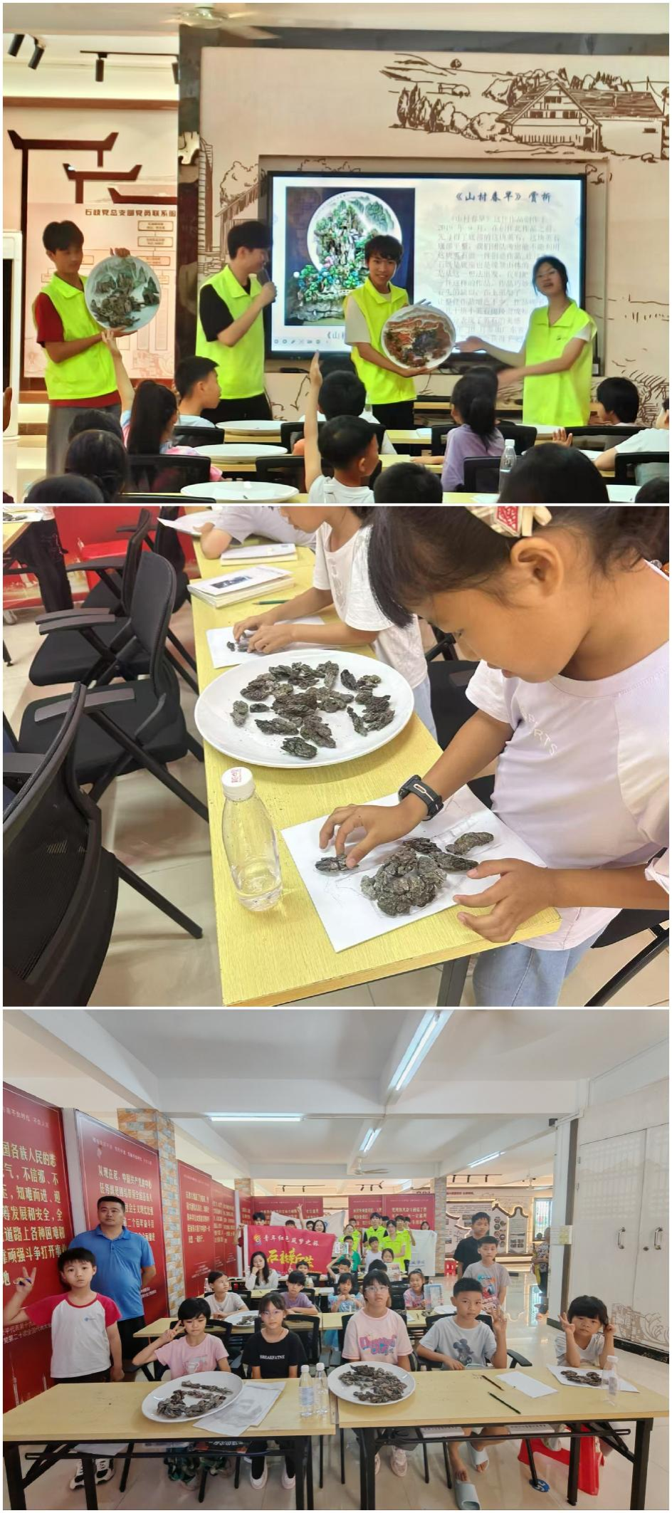 巧手传非遗,英石焕新彩:最让孩子们感到新奇和兴奋的,当属“英石碟景手工制作”课程。突击队员们将我们清远引以为傲的非物质文化遗产——英石艺术,带进了课堂。孩子们在哥哥姐姐们的指导下,亲手触摸、挑选形态各异的英石,学习碟景布局的巧妙构思,创作出一个个独具匠心的小小艺术品。这不仅锻炼了孩子们的动手能力和艺术创造力,更让他们零距离感受到了家乡文化的独特魅力,不少孩子自豪地表示要回家教爸爸妈妈认识英石。