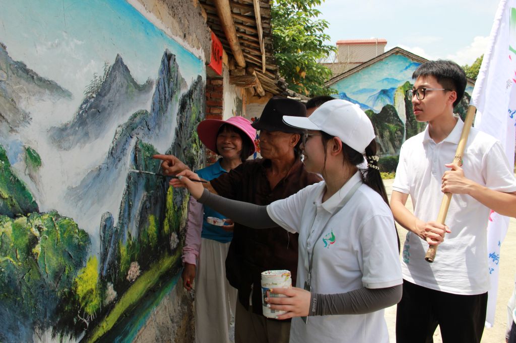 谈话间,李锦明热情地提议带大家去看看日常创作的雕刻工坊。一行人沿着小路前行,道路两侧的墙绘格外引人注目,这些皆是李锦明亲手绘制,色彩明快,内容丰富,既有乡村田园的淳朴风光,也有花鸟虫鱼的灵动姿态,将村庄点缀得充满艺术气息。这些墙绘不仅是他艺术才华的展现,更是他用画笔为乡村添彩的生动体现。队员们一边欣赏,一边感叹他的多才多艺,并悉心向其请教;李锦明毫无吝啬地指导擎苍突击队成员执笔创作“山水画”墙绘