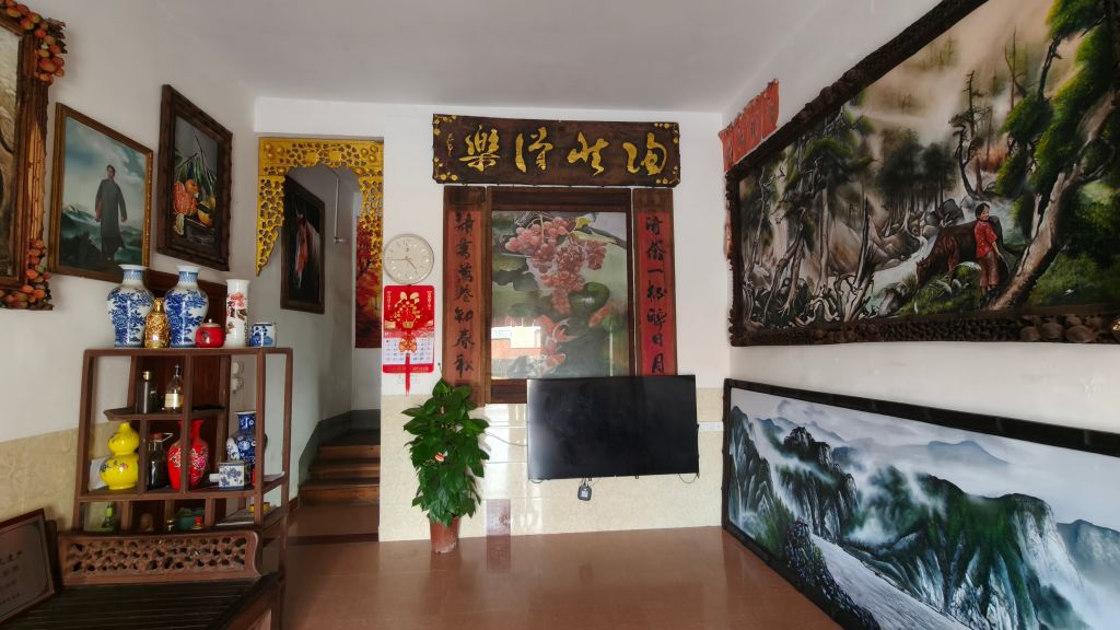 推开居所大门,队员们立刻被满眼的匠心之作震撼:家中随处可见他的作品,房屋梁柱、客厅八仙桌、博古架等所有家具器物,均由李锦明亲手雕琢。五年前,他回到家乡盖起一栋独具特色的楼房,建筑设计完全出自自己之手,整个居所宛如一座“活态艺术馆”,处处彰显着根雕艺术的独特韵味。