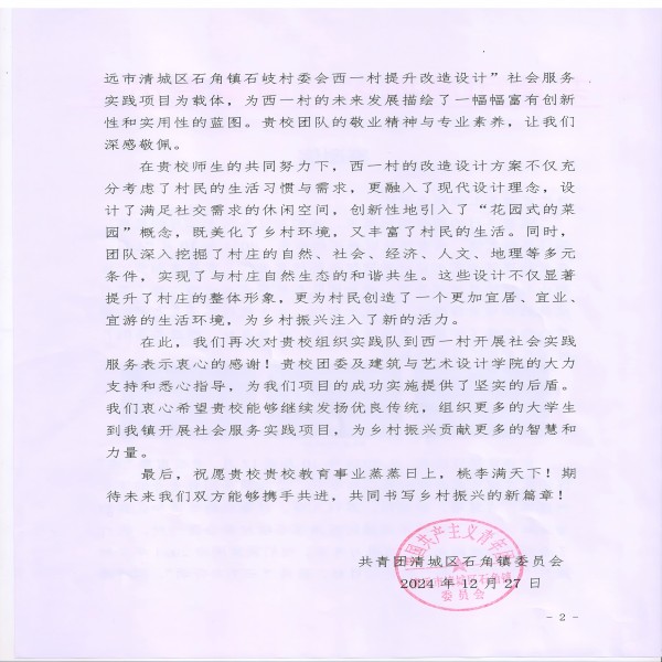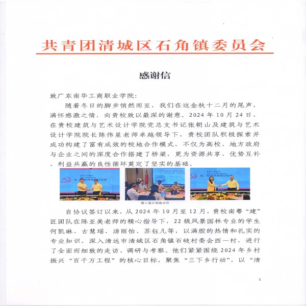 据悉,建筑与艺术学院自2023年启动“党建引领专业,助力乡村振兴”书记项目以来,便充分发挥专业优势、以设计赋能乡村振兴,师、生党支部组建了多支“百千万工程”突击队赴清远市清城区石角镇、清远市英德市浛洸镇、清远市连州市三水瑶族乡开展社会服务实践活动,充分发挥专业特长为美丽乡村建设注入青春力量。项目成果获得第三届印迹乡村创意设计大赛省级赛暨第二届粤乡印迹创意设计大赛优秀奖,清远市“百千万工程”成果展示大赛中荣获省职教城赛道决赛三等奖,获得南方Plus、清远Plus、清远日报视频号等主流媒体关注与报道。其中,建筑与艺术设计学院陈亚美老师带领的“南粤建匠”师生团队就深入石角镇内各处展开实地调研,以当地风土人情与历史文化为依托,融合现代建筑、艺术理念,精心定制了涵盖乡村建筑风貌提升、公共空间艺术营造、文化地标打造等多方面的多套规划方案。面对复杂实际情况与紧张的项目进度,他们始终保持积极热忱,攻克了诸多难题,高质量完成了各环节的任务,他们展现出的过硬专业素养、敬业精神与强烈社会责任感赢得了社会广泛认可,也收到了来自石角镇团委的感谢信(如图3所示)。
