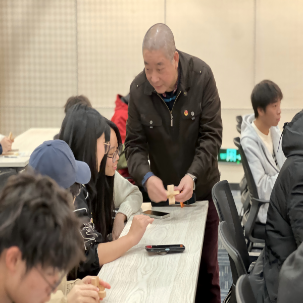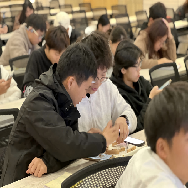 讲座的尾声,在丁全老师的指导下,同学们体验了木工制作的环节,对榫卯、斗拱结构有了进一步的认识。本次体验环节不仅锻炼了同学们的动手能力、对传统木工技艺有了更深入的认识,而且在实践中体验劳动的过程,在实践中感悟劳模精神。
