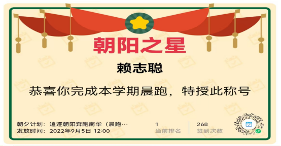 为了鼓励激励同学们坚持晨跑,活动设置累计在打卡小程序平台参与晨跑打卡50次以上即可自动荣获平台授予的“朝阳之星”荣誉称号证书,学院还将根据奖励方案评选出晨跑最有活力班级与个人等。