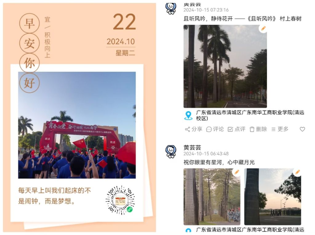 同学们可以通过在打卡小程序上传图、文或视频的形式进行每日记录、分享与交流,以及领取、分享精美每日心情日签。