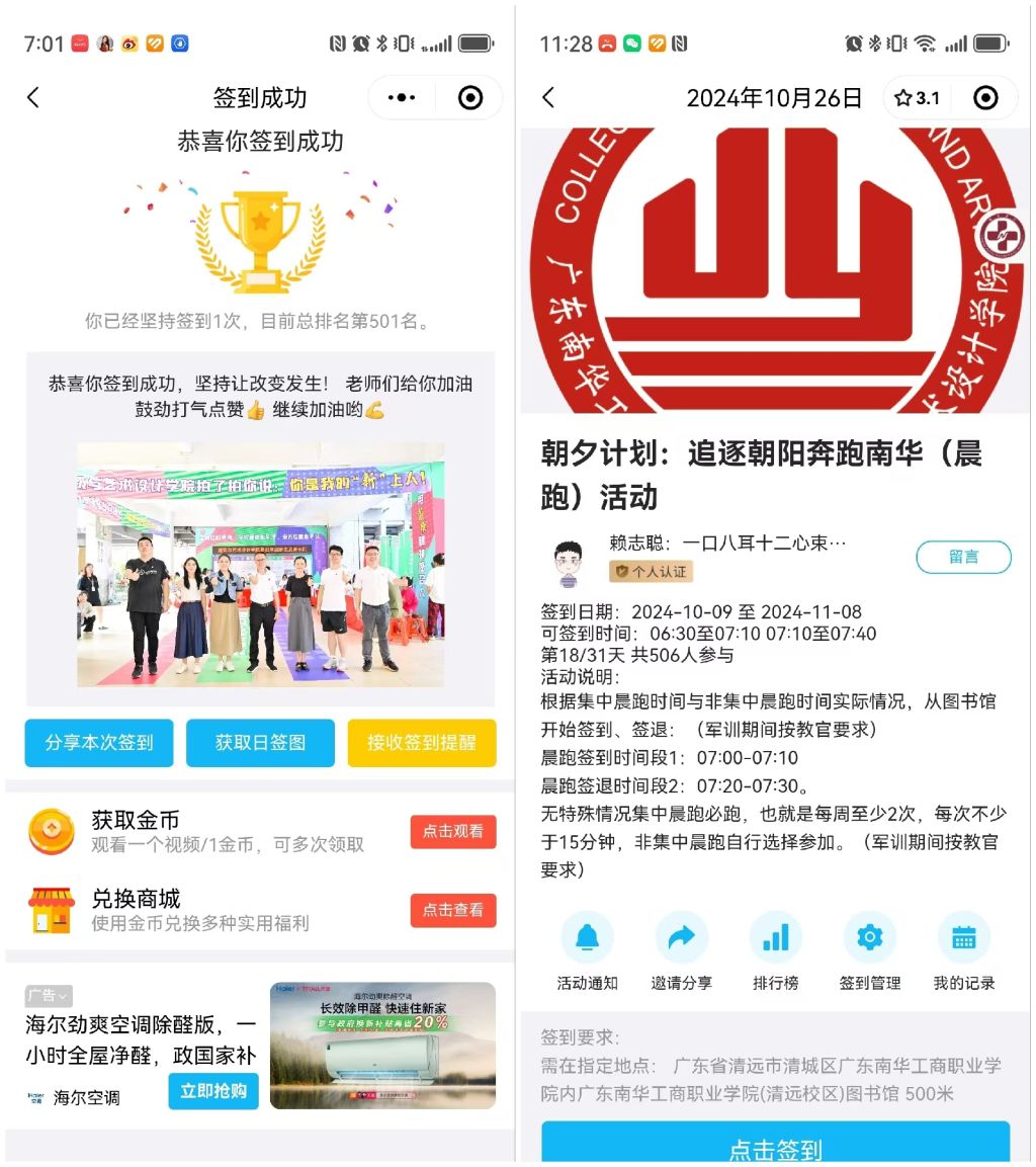 根据目前打卡小程序的统计,建筑与艺术设计学院2024级参与晨跑人数506人,已经统计了18天。他们每天签到、签退打卡成功都会获得学院老师们的恭喜、加油、鼓劲、打气、点赞图。