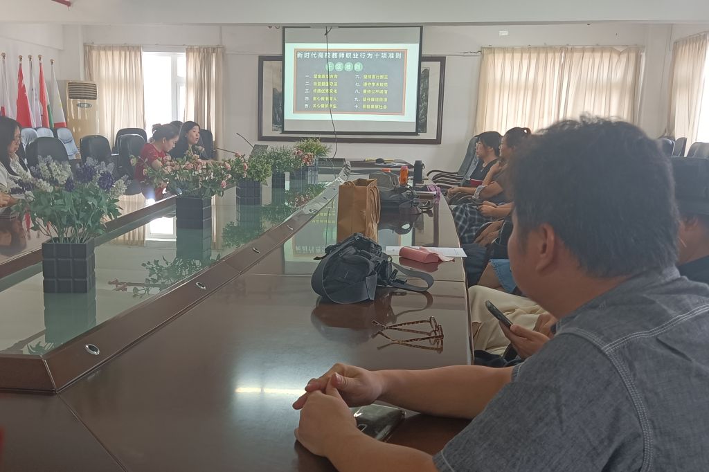 学院党总支常务副书记梁萍萍做“躬耕教坛 强国有我”师德专题报告,强调“学高为师,身正为范”,要求学院全体教职工做到:一、筑牢政治忠诚,从思想上根固为师的初心、决心;二、汲取楷模精神,从行动上树立为师的仁爱、仁德;三、紧跟高质量发展脚步,从业务上扎实为师的专业素养、学识;四、牢记育人使命,从根本上坚守为师的爱心、衷心。