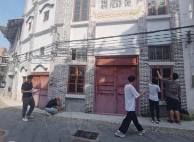 学生们现场测量和平街主要建筑尺寸