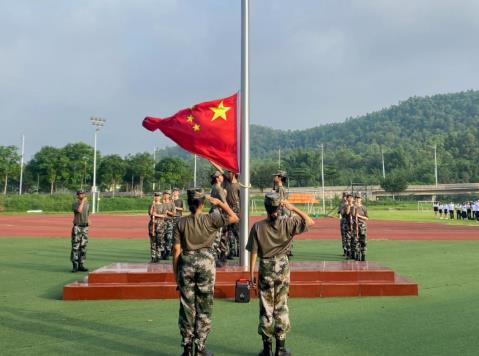 早晨7 时整,升旗仪式正式开始,学校国旗护卫队迈着整齐的步伐,庄严地将国旗护送至升旗台。伴着国歌,升旗手振臂一挥,五星红旗冉冉升起,迎风飘扬。全体师生行注目礼,唱响国歌。