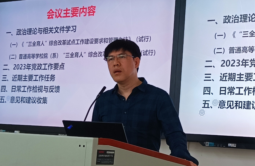 陈伟星院长围绕学院2023年党政工作要点,对学院各项工作的总体思路、计划和目标进行了系统讲述,强调2023年学院要以高质量党建引领学院各项教学行政工作高质量发展,以考核指标量化机制激活高质量发展,以优秀的教学管理团队赋能高质量发展,以“三种精神”特色育人擦亮高质量发展,以深化“校企合作,产教融合”提速高质量发展,通过积极申报校内实训基地建设,用优质办学条件支撑高质量发展。