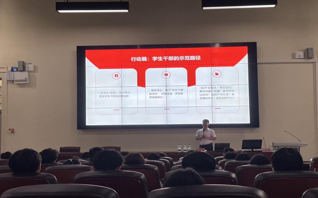 赖志聪老师强调新时代青年需肩负政治责任,加强政治理论学习与关注时事政治,不断增强“四个意识”、坚定“四个自信”、做到“两个维护”,要在志愿服务、学风建设、校园文化以及“百千万工程项目”、“挑战杯”、“互联网+”等活动以实际行动发挥带头作用,并向与会人员发起“六个一”行动计划:呼吁大家精读一本理论著作、结对帮扶一名同学、参与一个比赛项目、组织一次主题活动、解决一个实际问题、提交一份思想汇报,努力成为“有理想、敢担当、能吃苦、肯奋斗”的新时代青年!