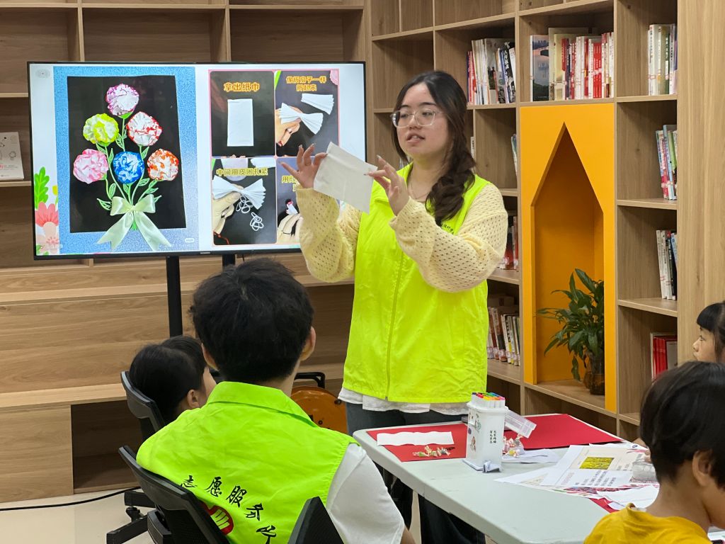 图3:大学生志愿者为青少年演示如何制作康乃馨
