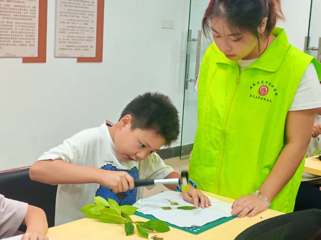 植物拓印课程以“自然与艺术的对话”为主题。志愿者首先为孩子们系统讲解了拓印技艺的历史沿革、文化内涵与植物选材要领,随后现场演示了固定叶片、均匀敲拓与色彩晕染的完整流程。在志愿者一对一指导下,孩子们将采集的花草精心构思、细心布局,通过轻柔敲击,使植物的天然形态与色彩逐渐呈现于帆布之上。活动现场气氛专注而热烈,一幅幅各具特色的植物拓印作品在孩子们手中诞生。