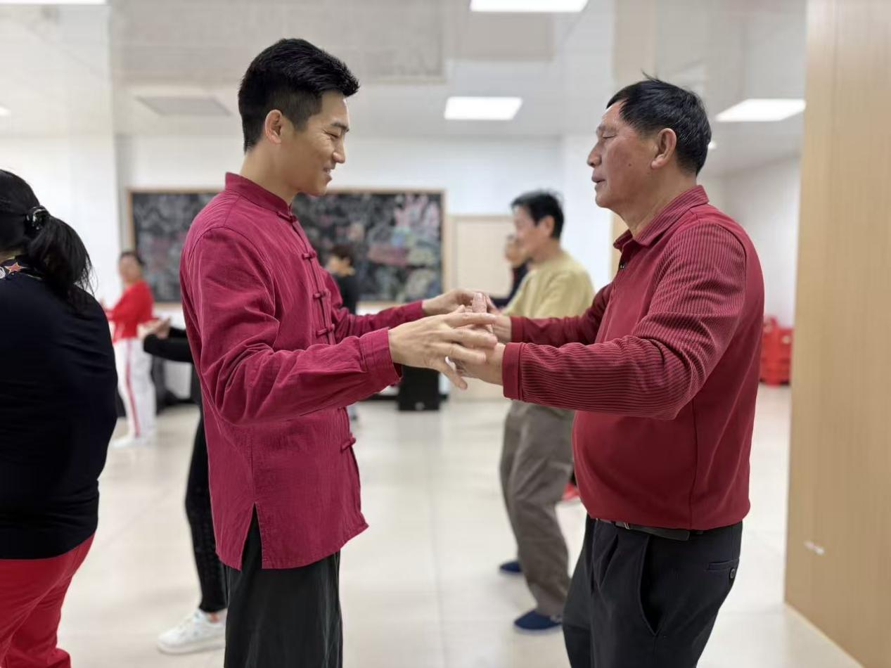 相较于首次活动,本期教学更注重细节雕琢与个性化体验。甘老师不仅继续运用“如抱圆球”等生动比喻,更针对长者们的进步情况,引入了简单的推手感知练习,让大家在微妙的力道变化中理解太极“听劲”与“化劲”的趣味,使得课堂在宁静中平添几分互动生机。许多“老学员”已能流畅衔接动作,新加入的长者也很快融入其中,活动现场氛围融洽,暖意融融。