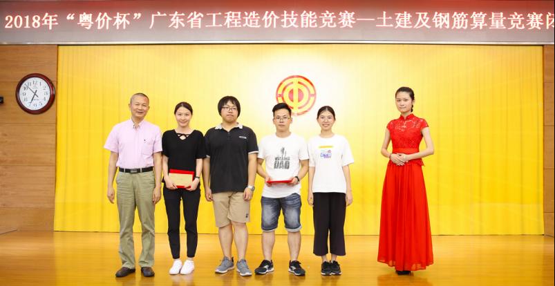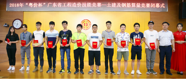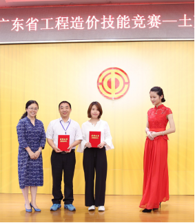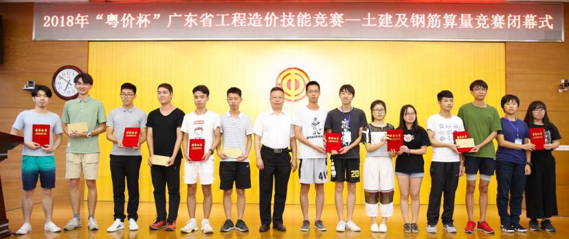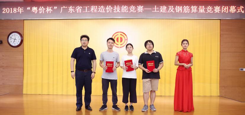 赛事当天,经过长时间的激烈角逐,最终闭幕式及颁奖仪式于18:00在天河校区行政楼4楼多功能报告厅举行,广东省总工会经工部田紫光部长、广东省工程造价协会许锡雁秘书长,广东南华工商职业学院王学真副校长、唐晓林副校长等人,以及参赛教师及学生共250多人共同出席了闭幕式及颁奖仪式现场。颁奖仪式由陈文奇老师主持,田紫光部长为闭幕式致辞,他表示此次竞赛是造价专业院校与行业协会、企业之间团结协作、合作共赢的桥梁,技能大赛是选拔、促进优秀技能人才脱颖而出的手段,有利于在社会上形成尊重劳动、重视技能、敢于创造的良好风气,并强调了工匠精神。之后许锡雁秘书长向广东南华工商职业学院颁发了优秀组织奖。最后公布了一、二等奖获奖名单,并对各赛项一等奖的获得者颁发了荣誉证书及奖金。我校派出建艺学院工程造价专业4名学生参赛,挑战赛中叶凡获得一等奖,另外3人均获得二等奖。常规赛中,我校刘欢欢、辛树艺队伍获得了第二名、一等奖的好成绩!林桂丽、叶凡战队也获得三等奖的好成绩。2018年“粤价杯”工程造价技能竞赛圆满完成!