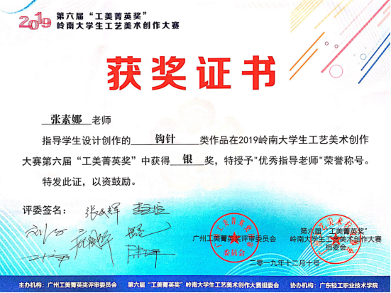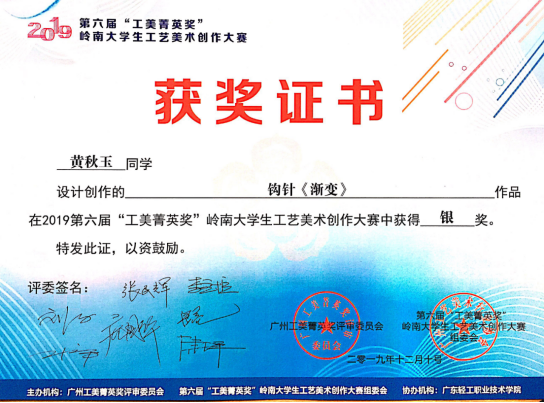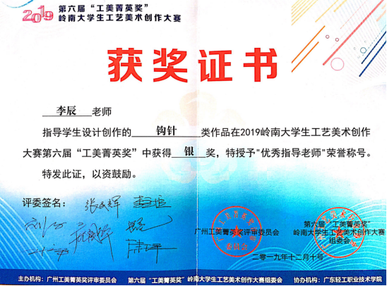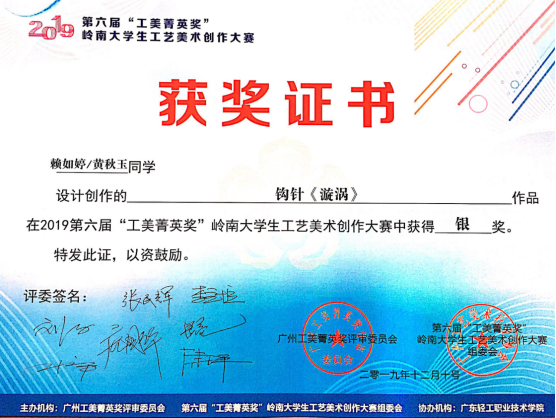 经过组委会的组织和七位专家评委的认真负责的评审,我校建艺学院18级服装专业学生,“品色织造”项目组成员 赖如婷、黄秋玉,在李辰、张素娜老师的指导下,选送了两件(套)钩针编织作品参赛,获得银奖两项。李辰、张素娜老师获“优秀指导老师”荣誉称号。