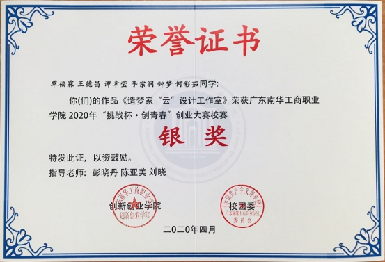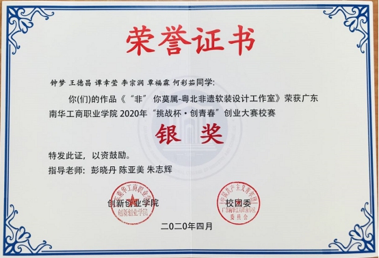为进一步推进第十二届“挑战杯.创青春”广东大学生创业大赛,2019.2月初开始,建装专业与环艺专业教师彭晓丹、陈亚美、刘晓老师就大赛相关筹备方案、执行细则等方面进行工作对接与热烈讨论,并就下一步辅导学生,经4个多月的修改、打磨、路演、等不同的关卡,经我校审查、校内专家组评审推荐、校外专家评审,我院的钟梦、王德昌、谭幸莹、李宗润、覃福霖、何彩如的作品“非”你莫属-粤北非遗软装设计工作室和造梦家“共享设计”工作室分别获得广东南华工商职业学院2020年“挑战杯.创青春”创业大赛校赛的银奖.