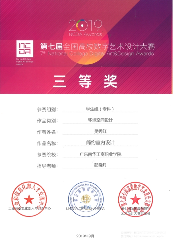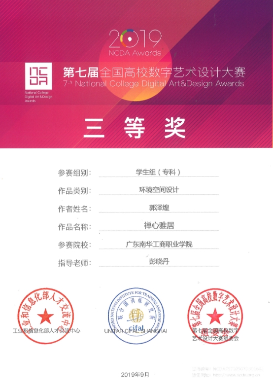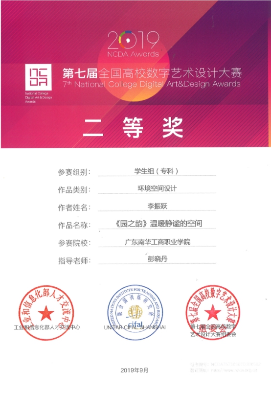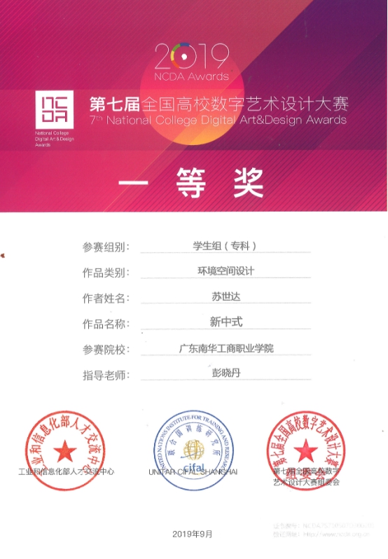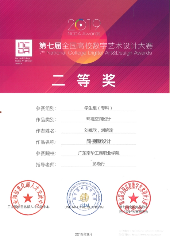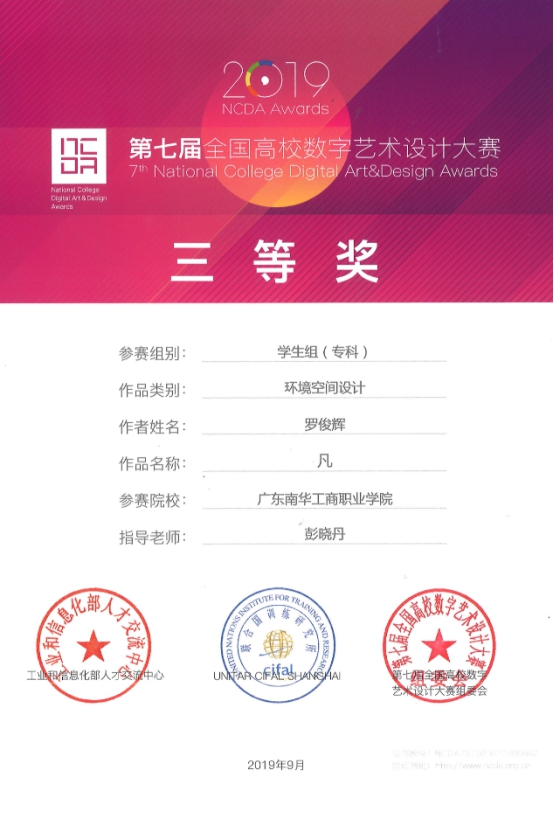 环境艺术设计专业师生在第七届全国高校数字艺术设计大赛中取得了可喜的成绩,师生们在国赛中获奖作品共计7件,其中一等奖1项;二等奖2项;三等奖项;优秀指导教师1项。特此祝贺。