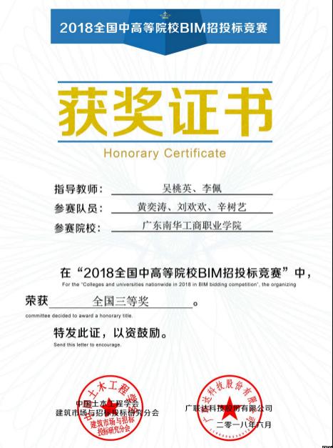随着电子招投标技术在国家及各省市公共资源中心的建设推广,BIM+电子招投标技术在规范和净化招投标环境的应用越来越重要,掌握基于BIM的电子招投标技术成为建筑工程相关专业学生重要的技能,为了促进全国中高等院校的共同学习和交流,中国土木工程学会建筑市场与招标投标研究分会主办、广联达科技股份有限公司承办了“全国中高等院校第二届BIM招投标网络竞赛”,比赛于2018年3月27日-6月15日在网络上进行,我校派出了1支学生队伍参加了比赛。